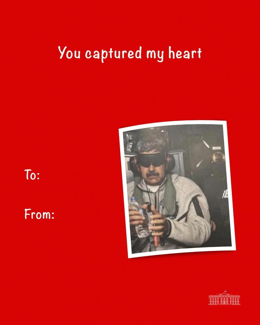 وجاء على البطاقة الأولى “لقد أسرتِ قلبي”، وتضم صورة للرئيس الفنزويلي نيكولاس مادورو وهو يُنقل خارج فنزويلا مكبلا بالأصفاد ومعصوب العينين بعد عملية “العزيمة المطلقة”.